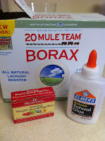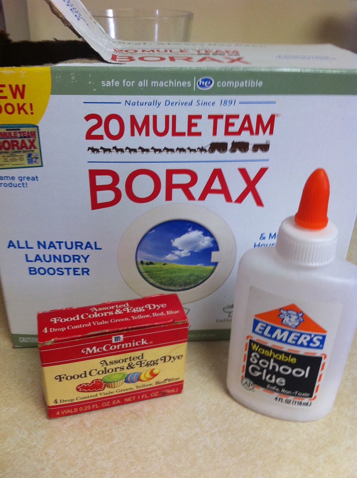 This is a fun craft project (or science project) for an indoor afternoon. You can make your own homemade slime!! (The slime is actually a polymer, with Borax serving as a the crosslinking agent for the glue molecules to string together to form larger molecules – the polymer.) This is quite simple to do. I love the way ours turned out with that funky green color!