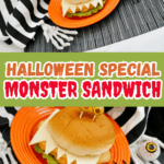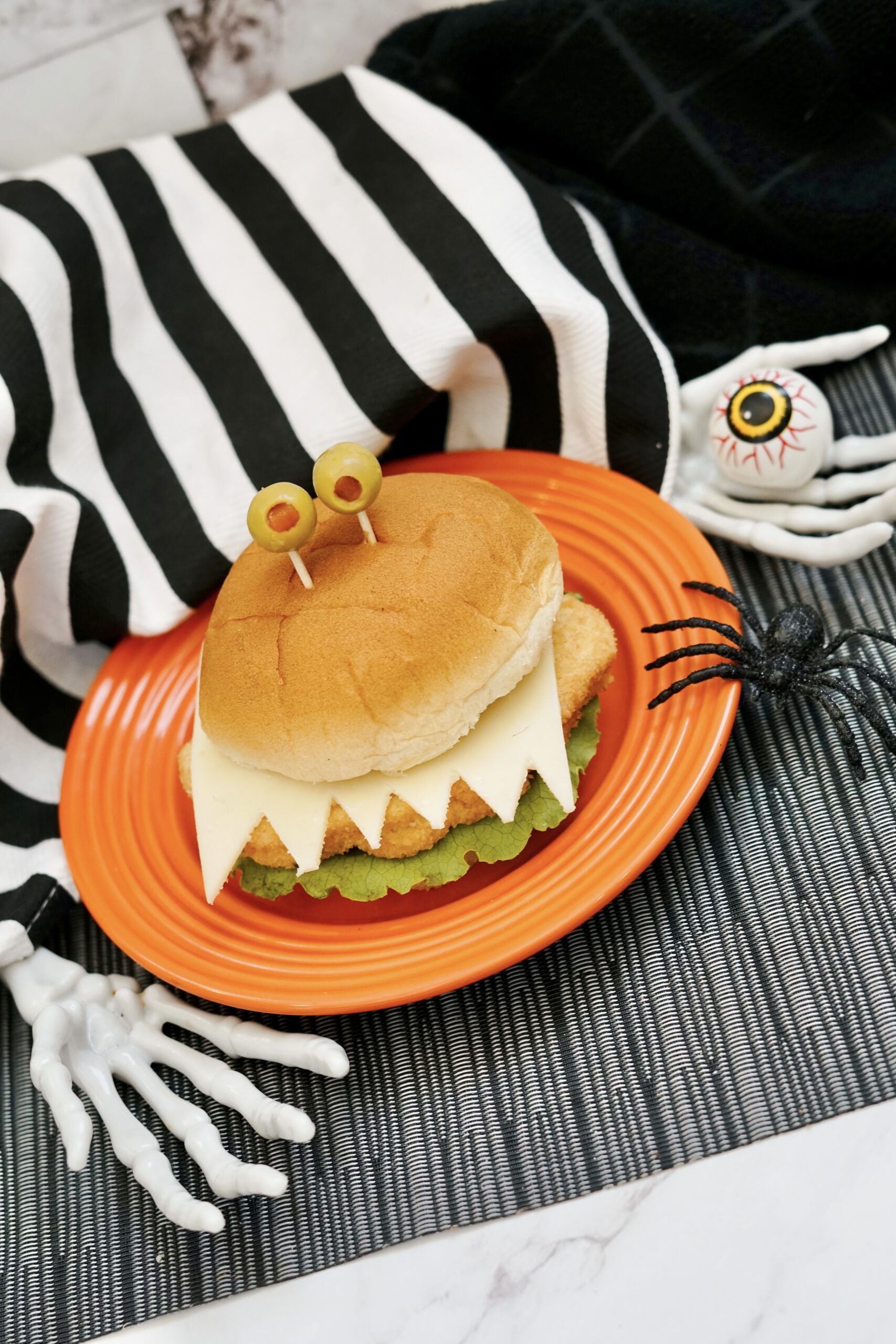 These Monster Chicken Sandwiches are a fun and easy Halloween meal made with chicken patties, cheese slices cut into monster teeth, and green olive eyes on toothpicks. They come together in minutes and are perfect for kids and family parties!