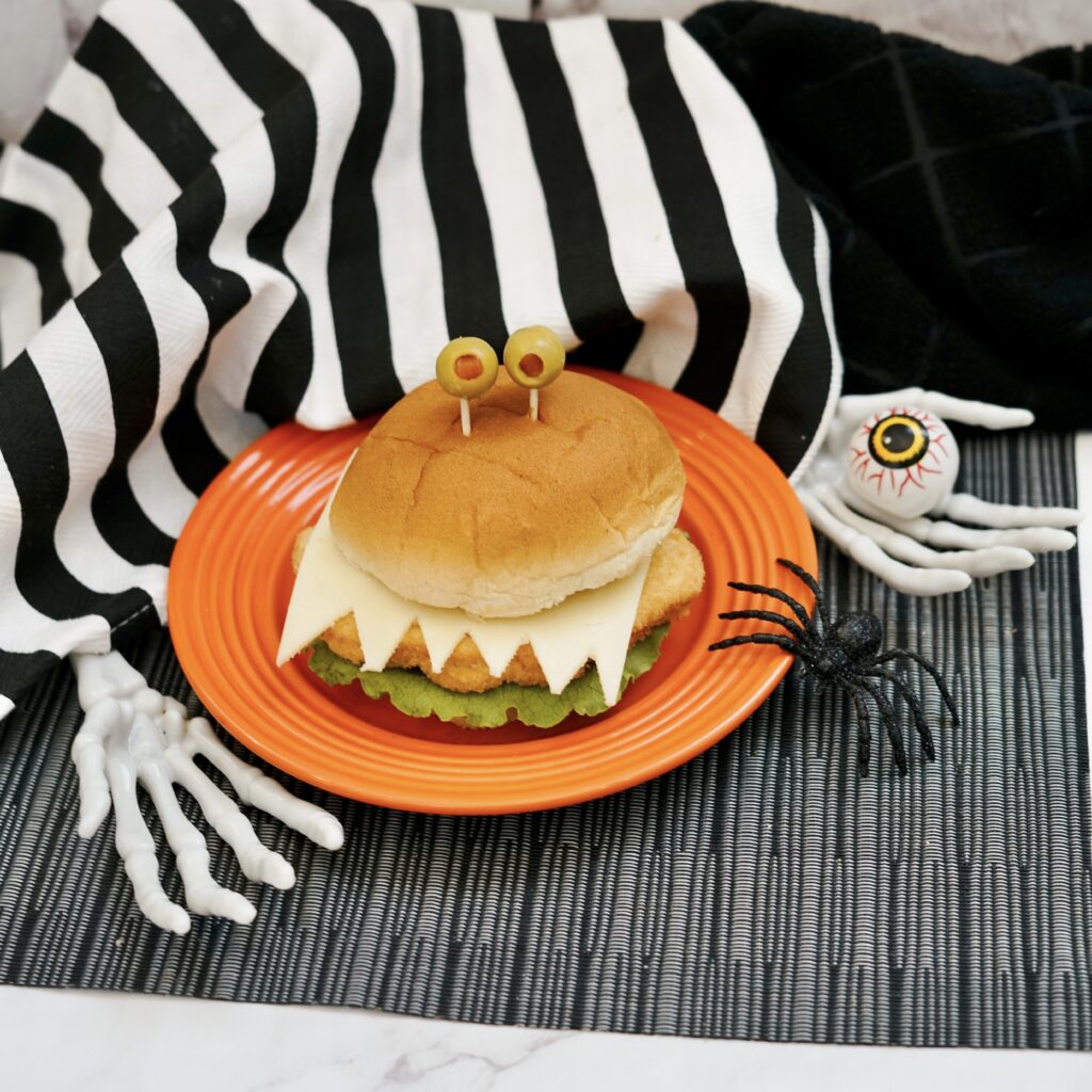 Turn an ordinary meal into a frightfully fun Halloween dinner with this Monster Chicken Sandwich recipe! Made with crispy chicken patties, gooey cheese, and silly olive eyes, these spooky sandwiches are perfect for a family Halloween party or a quick dinner before trick-or-treating.